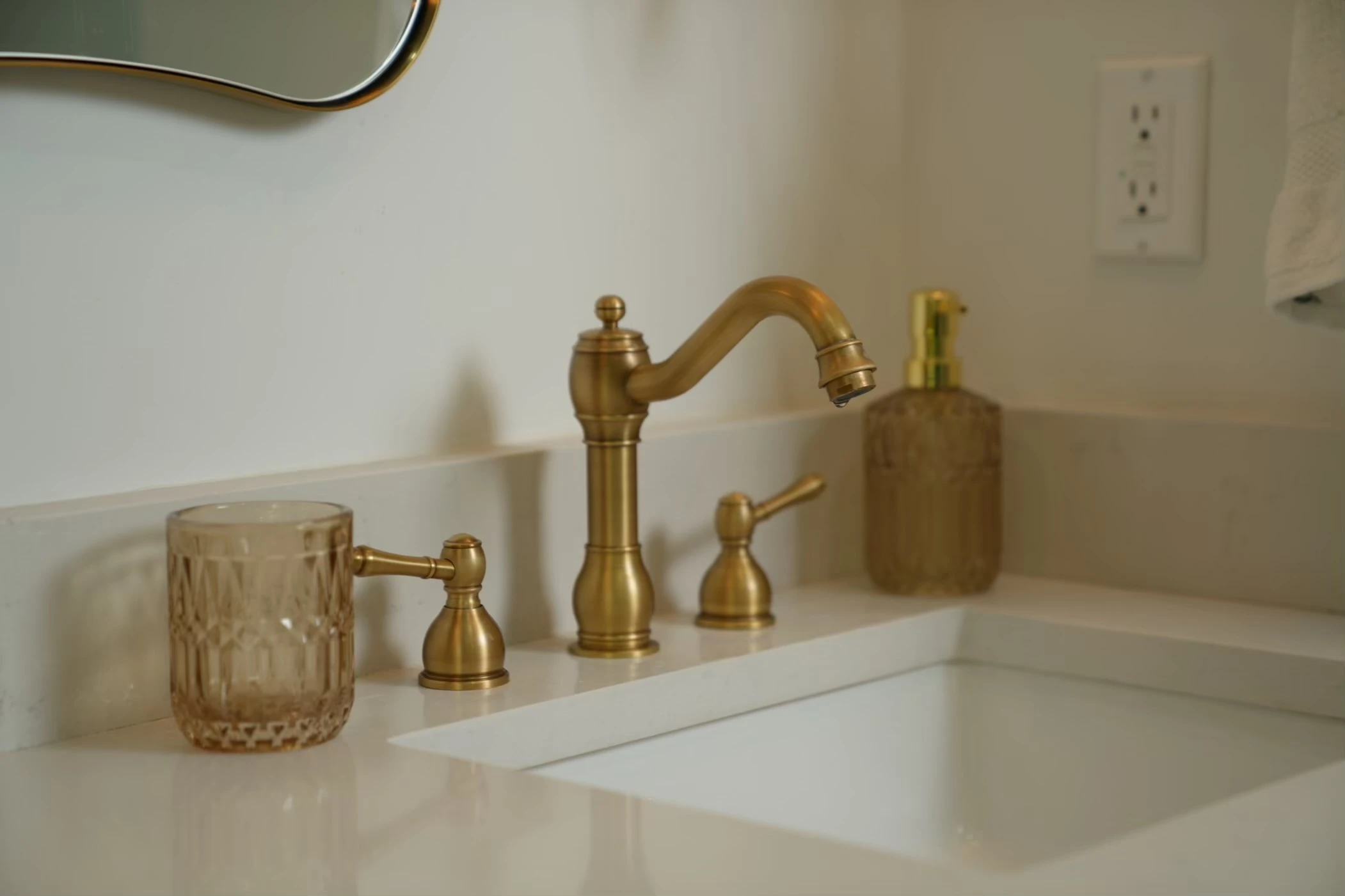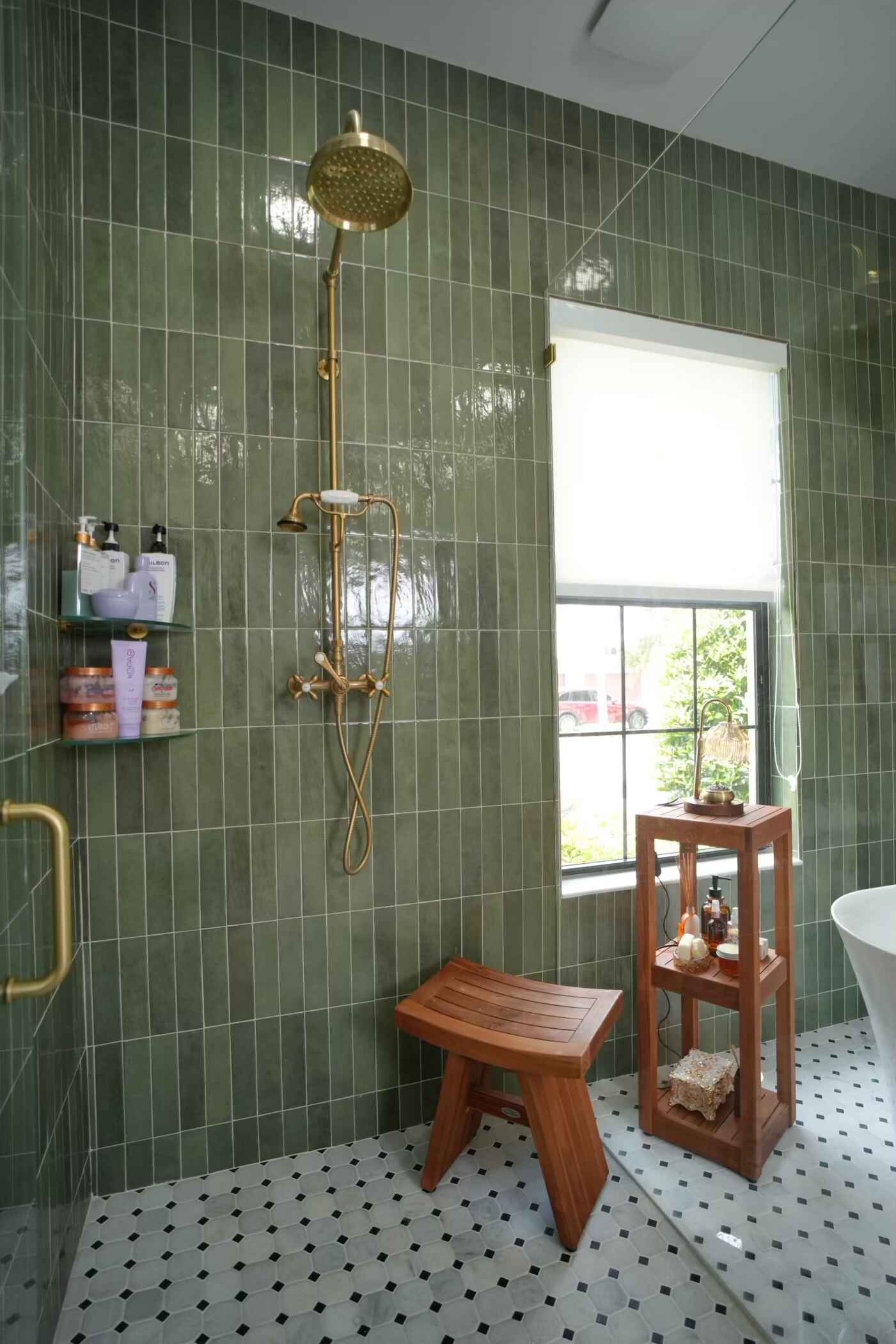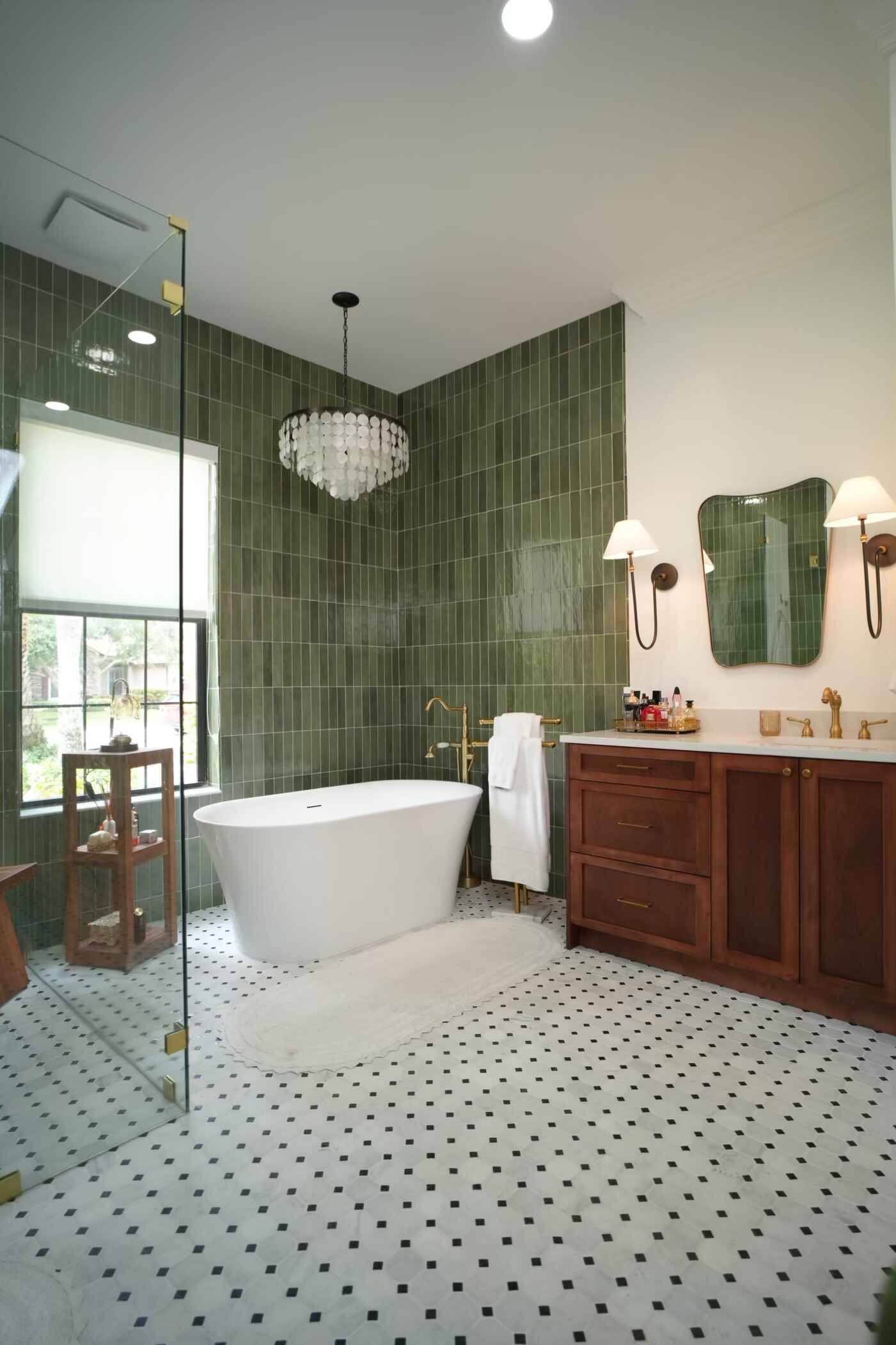 PROJECT DETAILS 5 + YEARS EXPERIENCE 100% CLIENT SATISFACTION 20+ FIVE-STAR REVIEWS 5 + YEARS EXPERIENCE 100% CLIENT SATISFACTION 20+ FIVE-STAR REVIEWS Botanical Luxe Bath Deep green hand-crafted tiles creating a striking backdrop for this sculputural soaking free-standing tub with elegant vintage brass gold fixtures and beautiful pattern marble floors.